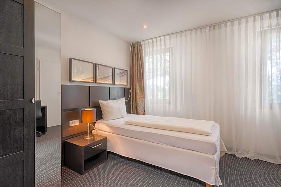 Simply furnished room with woodland views.